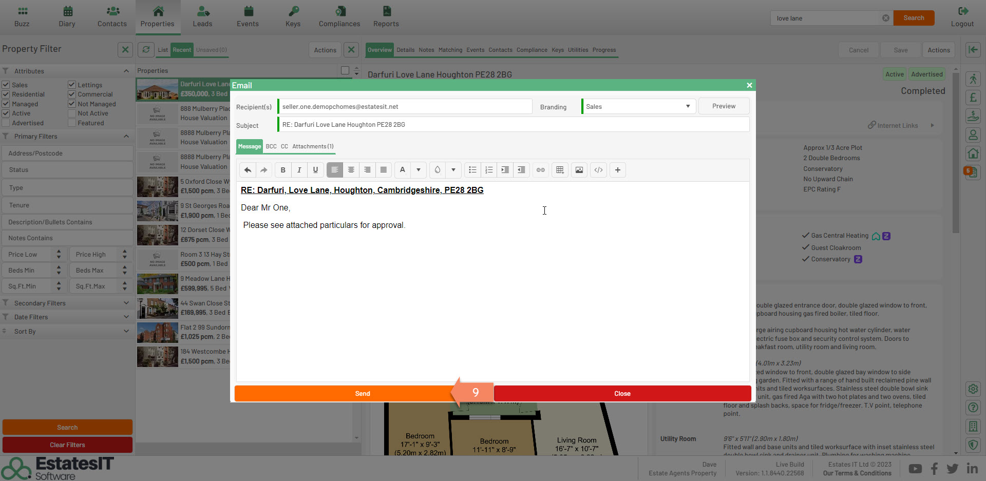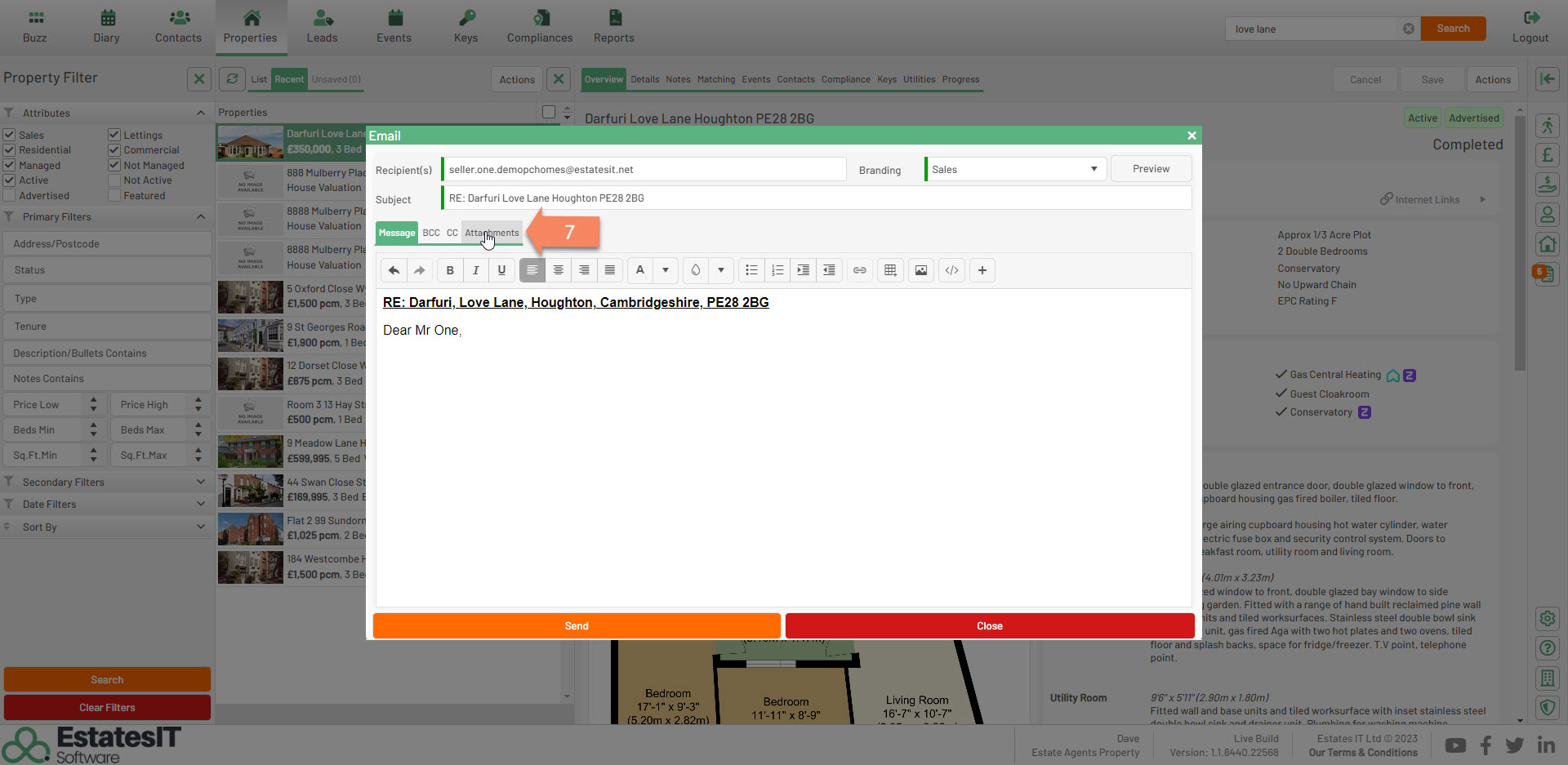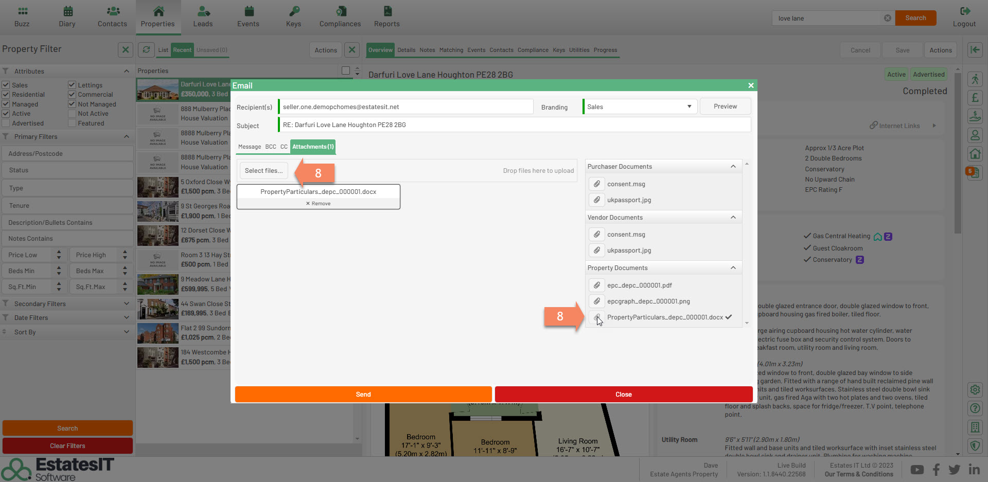 8. Select from the right hand side the Documents you wish to attach by clicking on the Paperclip icon. This screen will show you all sharepoint documents against the people on the property or the property. You can also select files if you wish to manually upload a document. Once you have the attached files click back on Message and write the Email to the contact and click on send.