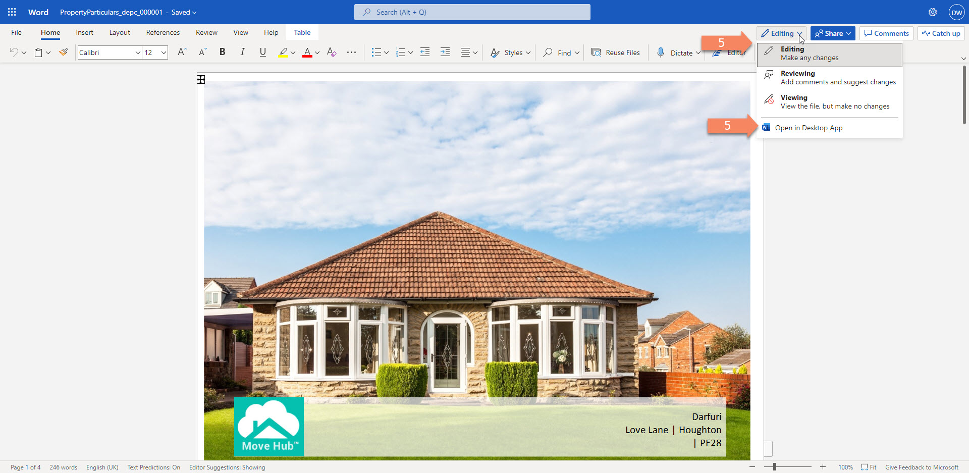 5.The particulars will open in word online which may not display correctly. At the top of the screen you can click on Editing and select open in desktop app.