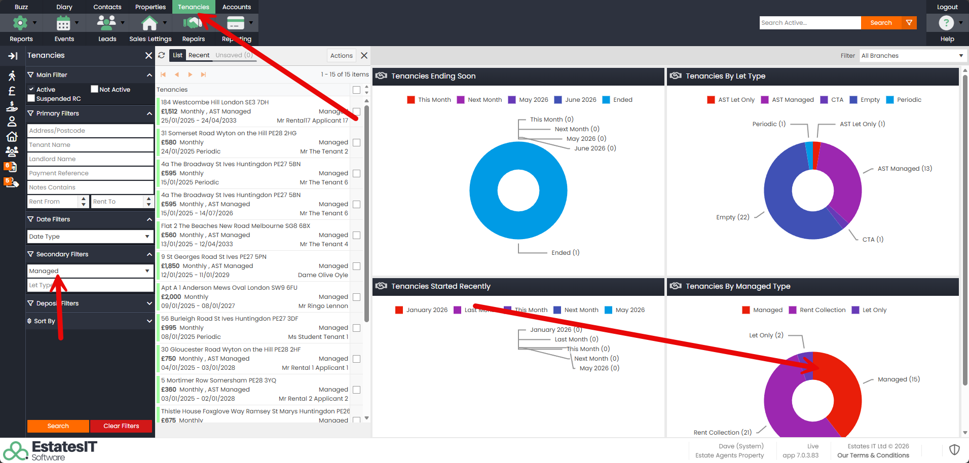 Step 1 : Go to the Tenancies tab and select an appropriate data set eg. “Managed properties”. You can click on elements in the pie-chart or use the filters in the left section.