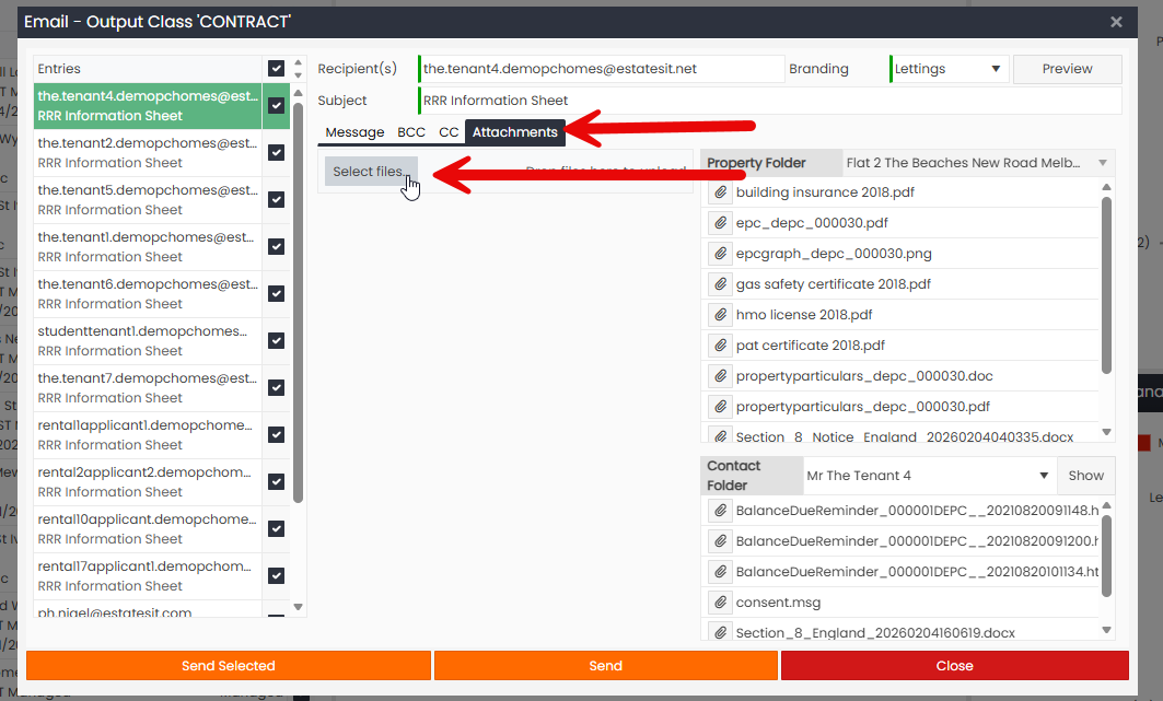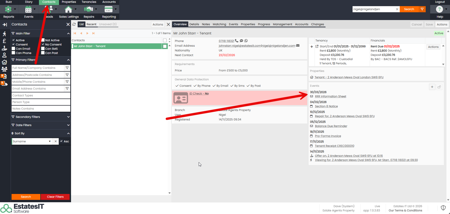 Step 6 : When you send it, we will log this as a diary event against the Tenant, as shown below: