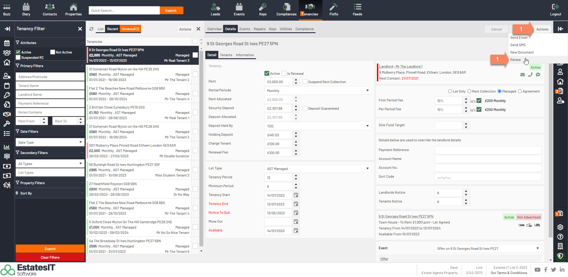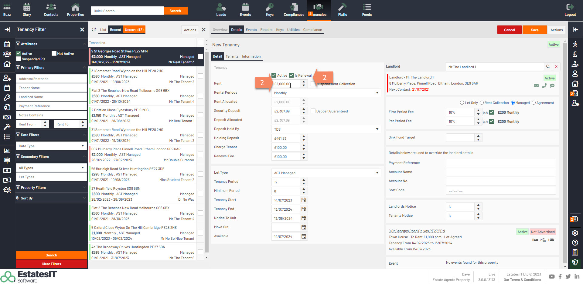 2. This will automatically renew the dates of the tenancy and tick the Is Renewal box. If you need to do a rent increase change it here. Then click on Save.