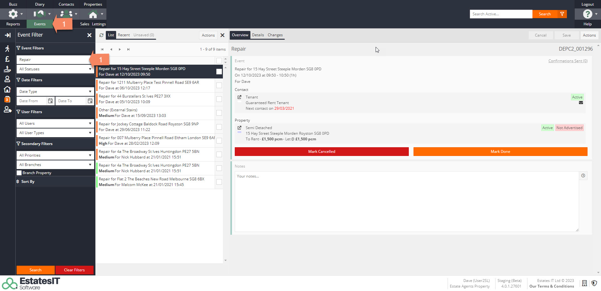1. From the events section you can filter to see a list of repairs. You can also filter by statuses or even date ranges.