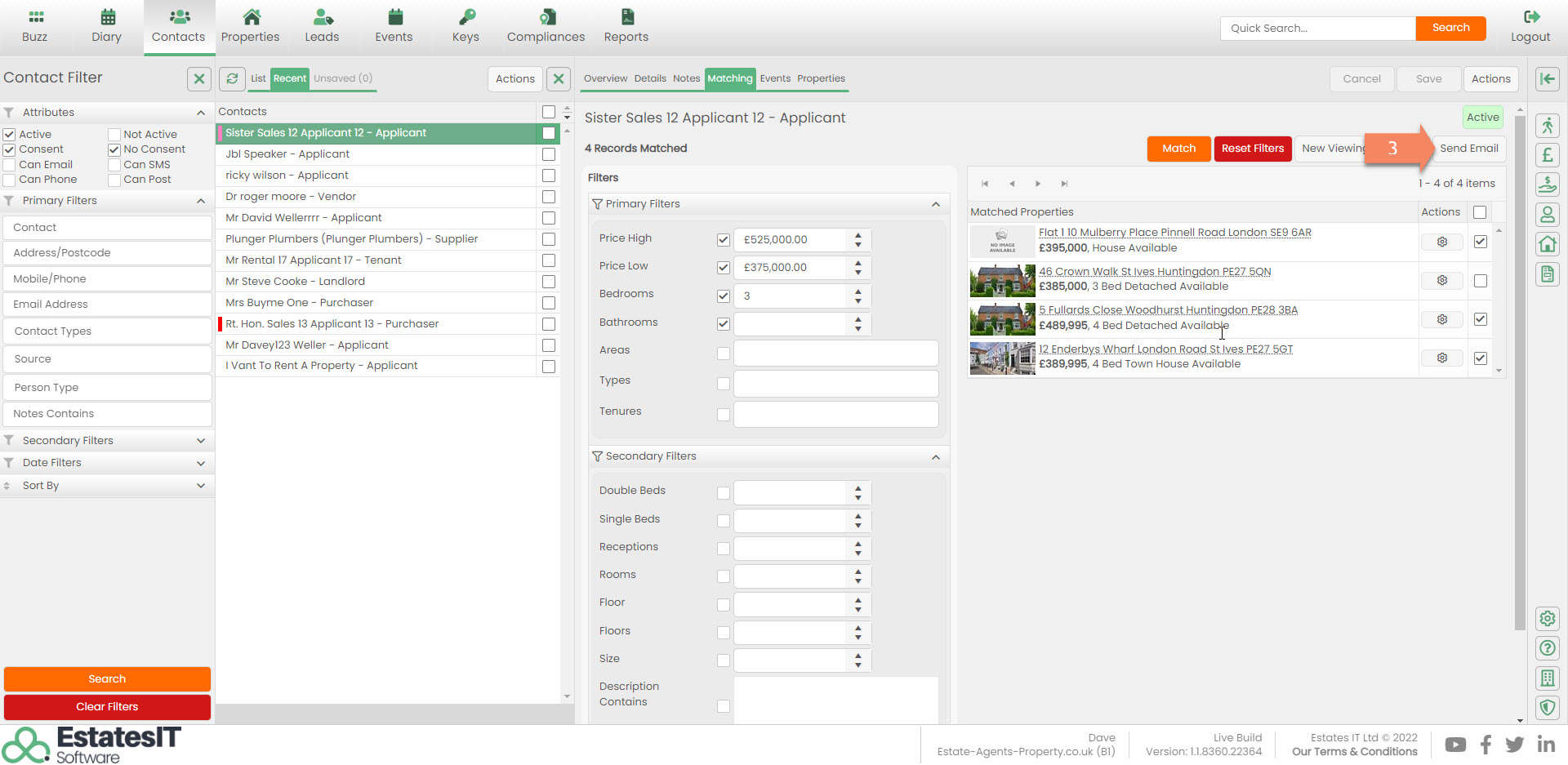 2. Tick the boxes next to the Cog button to select which properties you would like to send to the Applicant. If you want to send the whole match list of properties select the tick box just above them.