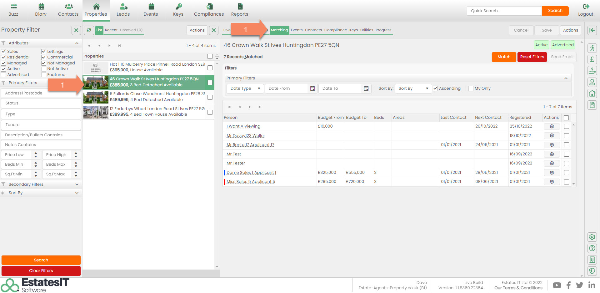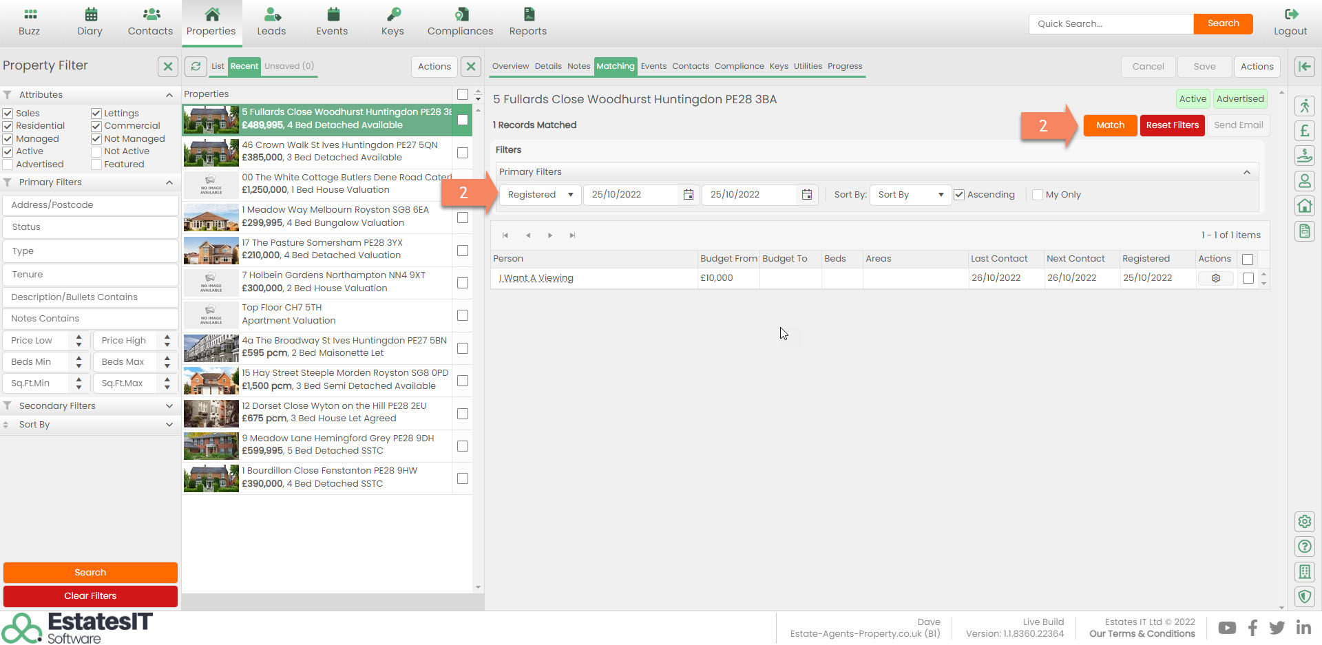 2. You might see lots of Applicants in the matching screen. These can be filtered down by using the filters like : Date Types (Registered/Last Contact/Next Contact) for example if you would like to send the property to all Applicants who registered today you can change the filters to allow this. Click on Match to apply the filter.