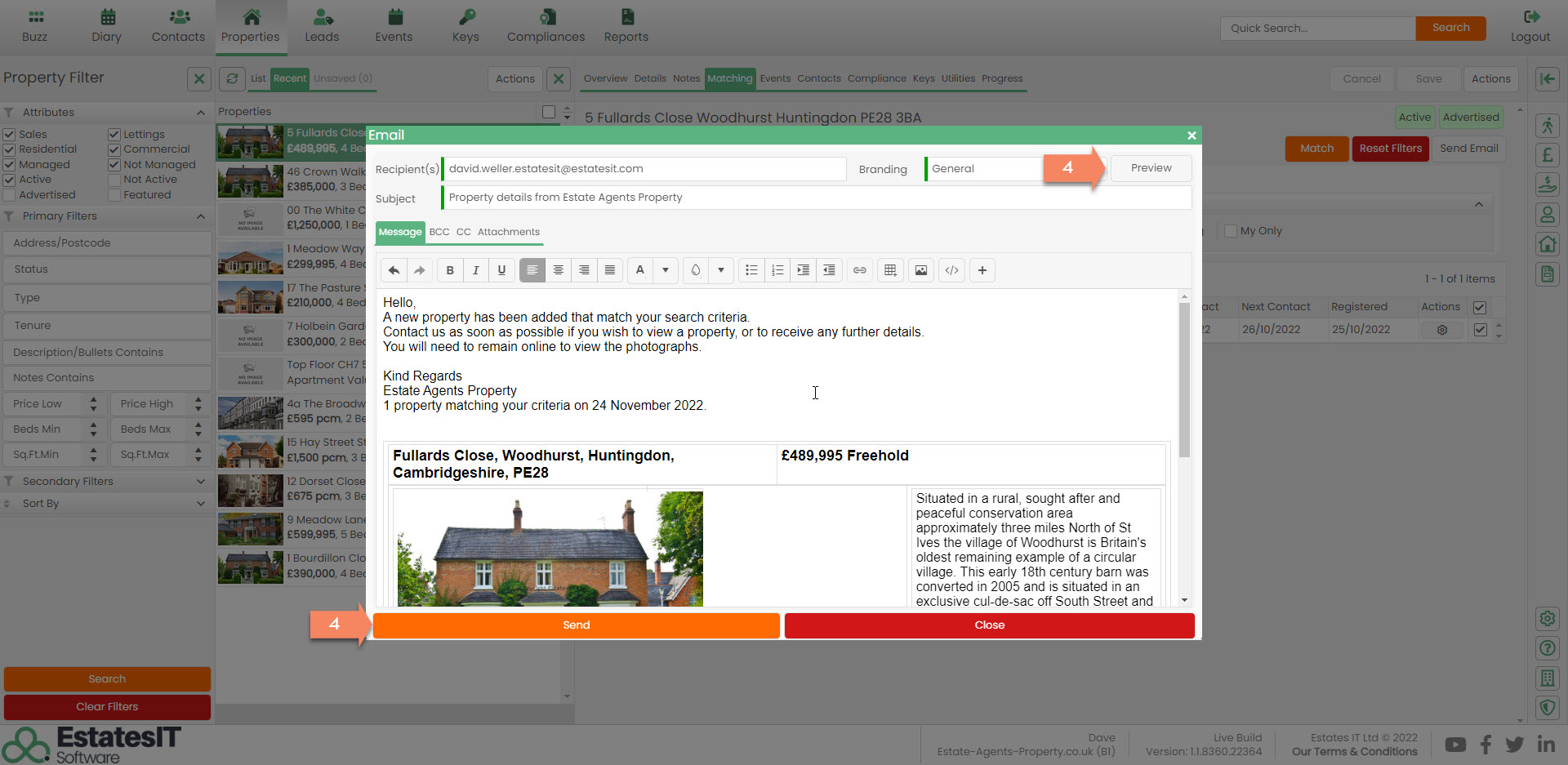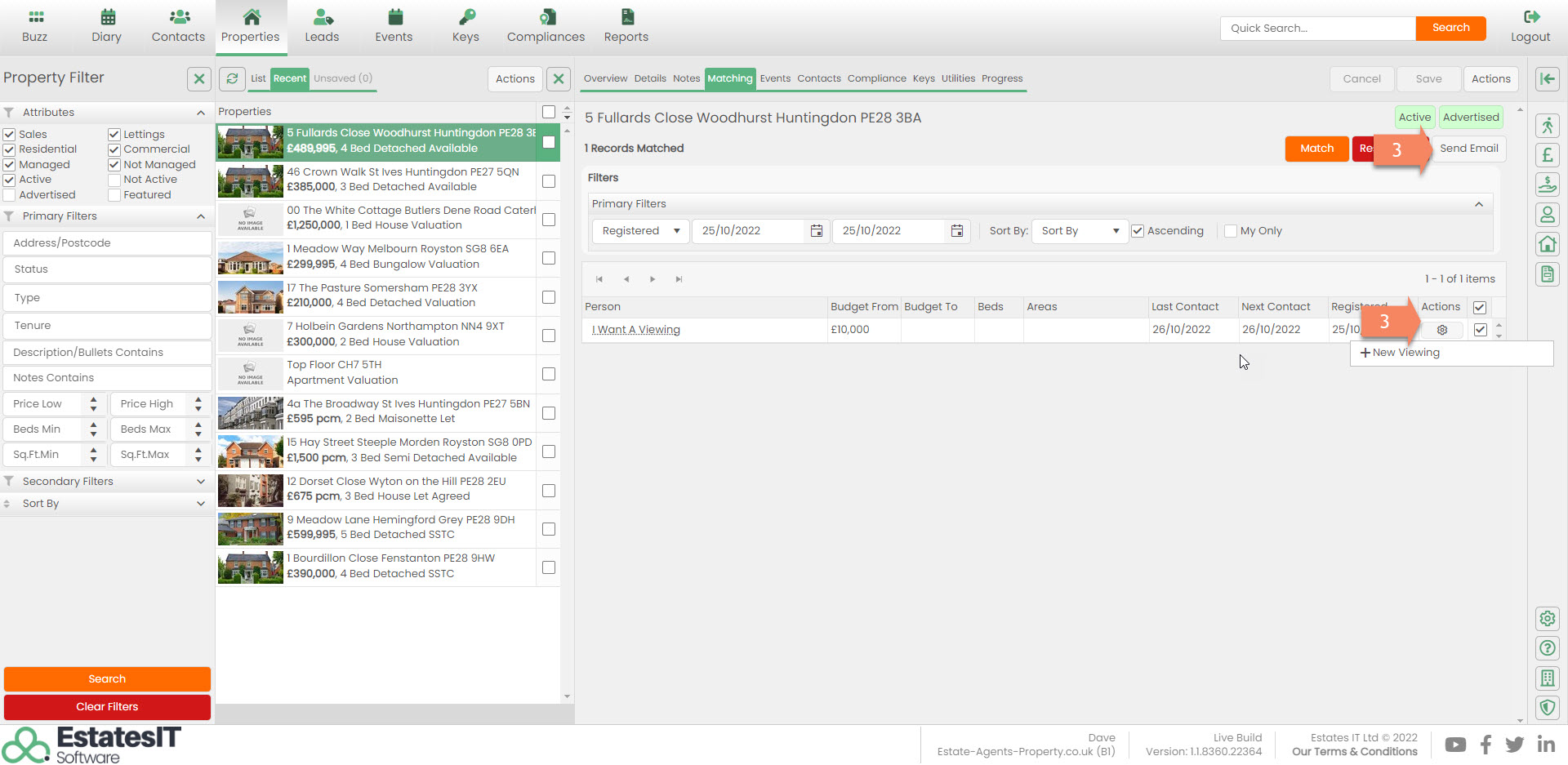 3. Click on the tick boxes on the right hand side to choose who you would like to send the property to. Once these are selected you can then click on Send Email. If you click on the cog next to the tick box you could also book a viewing for the matched property from here.