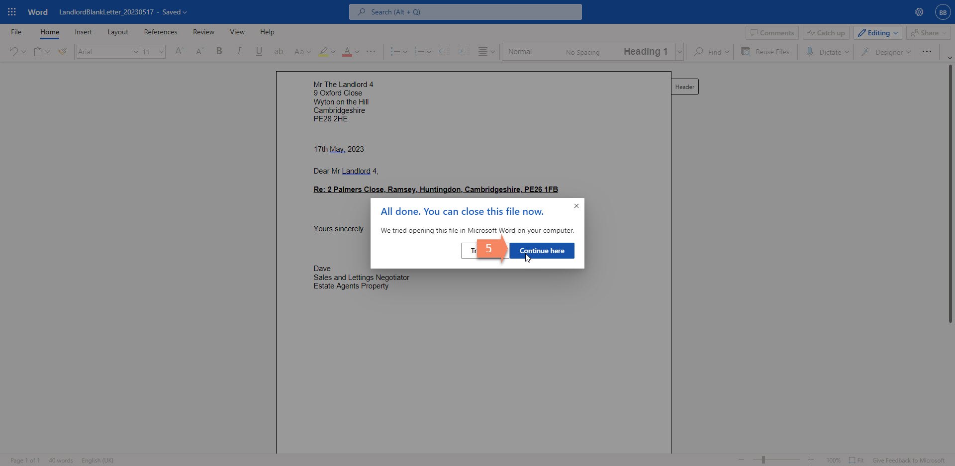 5. The letter will then open up in desktop version of word and you will also see the message below you can click on continue here.