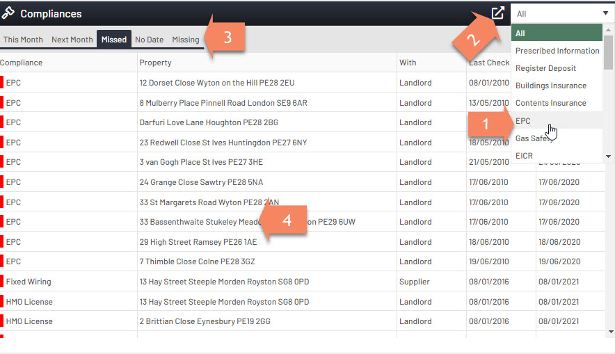 4. If you click in the grid this will open up the compliances section for that property.
