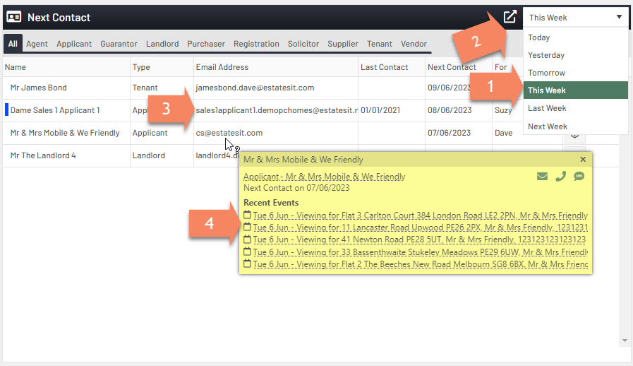 4. If you hover over an event it will popup a yellow box which has information about the contact and will also allow you to click through or send an email/sms to the contact. This section will also you the recent events list.