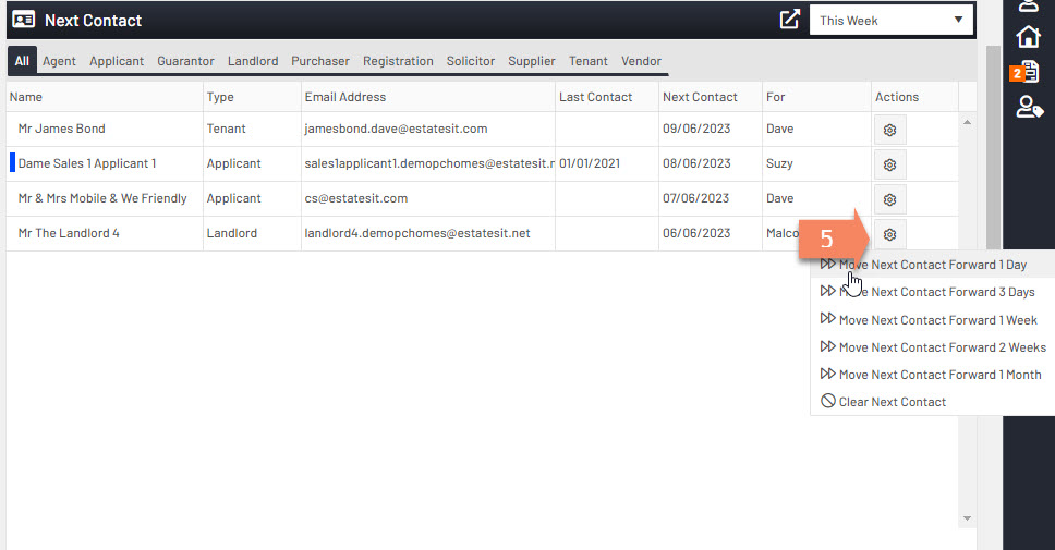 5. If you click on the little cog icon this will allow you to move the contact forward a number of days which means they will not show on your next contacts section until that date. You can also clear next contact date which will remove them completely from the buzz section.