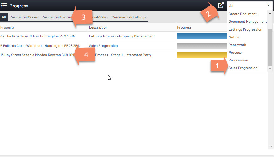 4. If you click in the grid this will open up the progress section for that property.